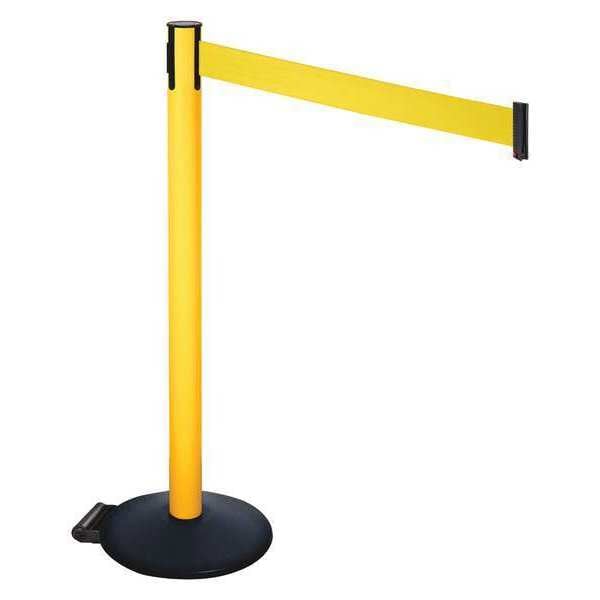 Barrier Post with Belt, Maximum Overall Height 40 in, Legend No Legend, Legend Color Not Applicable, Number of Belts 1, Belt Length 10 ft, Belt Width 3 in, Belt Color Yellow, Post Color Black, Product Type Stanchion, Includes (2) Wheels, Minimum Overall Height Not Applicable, Post Diameter 2 1/2 in, Post Material Vinyl, Post Finish Powder Coated, Base Type Round Sloped, Base Diameter 14 in, Base Material Cast Iron, Base Finish Powder Coated, Base Color Black, ADA Compliance No