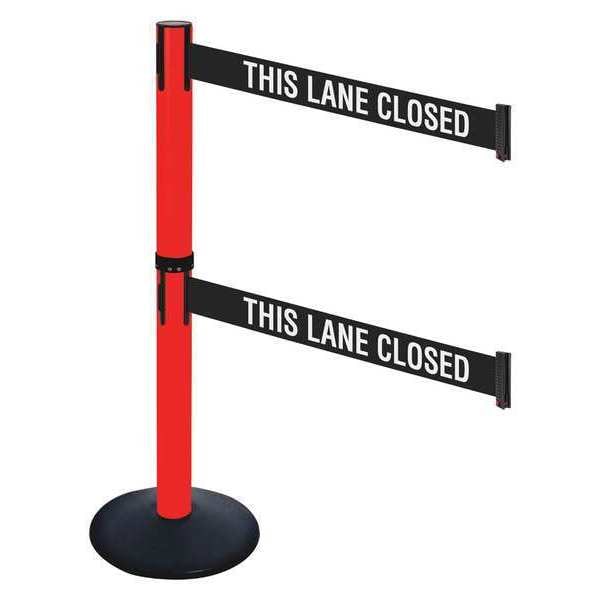 Barrier Post with Belt, Maximum Overall Height 40 in, Legend This Lane Closed, Legend Color White, Number of Belts 2, Belt Length 10 ft, Belt Width 3 in, Belt Color Black, Post Color Red, Product Type Stanchion, Includes Hose Clamp Fixing, Wire Clip Belt End, Minimum Overall Height Not Applicable, Post Diameter 2 1/2 in, Post Material Plastic, Post Finish Powder Coated, Base Type Round Sloped, Base Diameter 14 in, Base Material Cast Iron, Base Finish Powder Coated, Base Color Black