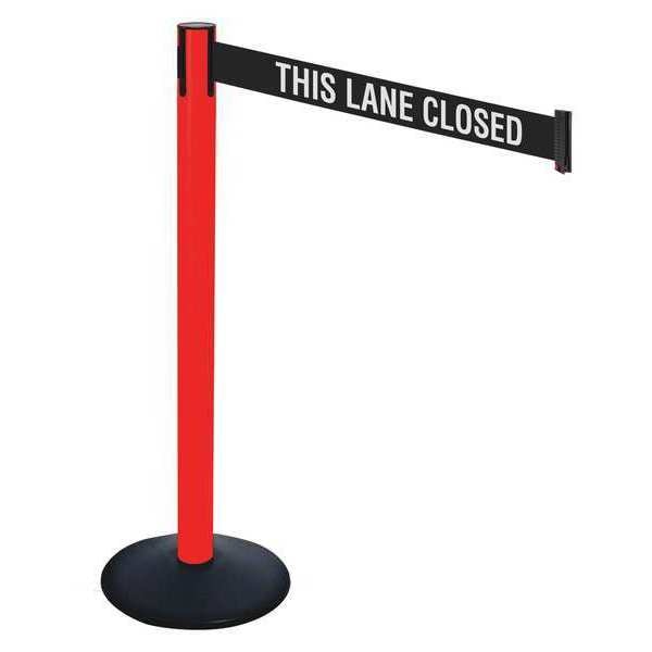 Barrier Post with Belt, Maximum Overall Height 40 in, Legend This Lane Closed, Legend Color White, Number of Belts 1, Belt Length 10 ft, Belt Width 3 in, Belt Color Black, Post Color Red, Product Type Stanchion, Includes Hose Clamp Fixing, Wire Clip Belt End, Minimum Overall Height Not Applicable, Post Diameter 2 1/2 in, Post Material Plastic, Post Finish Powder Coated, Base Type Round Sloped, Base Diameter 14 in, Base Material Cast Iron, Base Finish Powder Coated, Base Color Black
