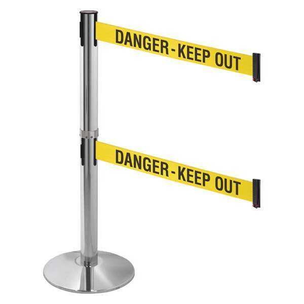 Barrier Post with Belt, Gray, 10 ft Length, 40 in Post Height, Danger Keep Out, Polished chrome