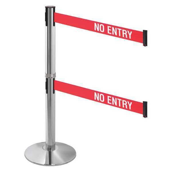 Barrier Post with Belt, Maximum Overall Height 40 in, Legend No Entry, Legend Color White, Number of Belts 2, Belt Length 10 ft, Belt Width 3 in, Belt Color Red, Product Type Stanchion, Includes Hose Clamp Fixing, Wire Clip Belt End, Minimum Overall Height 38 in, Post Diameter 2 1/2 in, Post Material Aluminum, Post Finish Polished, Base Type Round Sloped, Base Configuration Attached, Base Diameter 14 in, Base Material Cast Iron, Base Finish Polished Aluminum, ADA Compliance No