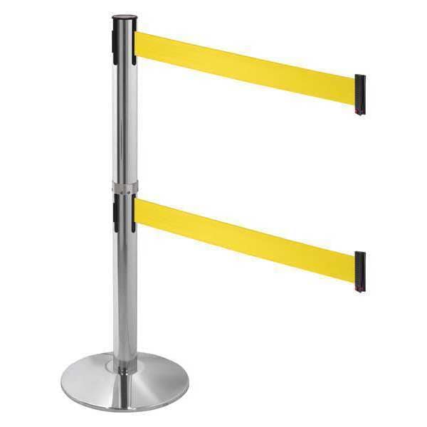 Barrier Post with Belt, Maximum Overall Height 40 in, Legend No Legend, Number of Belts 2, Belt Length 10 ft, Belt Width 3 in, Belt Color Yellow, Product Type Stanchion, Includes Hose Clamp Fixing, Wire Clip Belt End, Minimum Overall Height 38 in, Post Diameter 2 1/2 in, Post Material Aluminum, Post Finish Polished, Base Type Round Sloped, Base Configuration Attached, Base Diameter 14 in, Base Material Cast Iron, Base Finish Polished Aluminum, ADA Compliance No