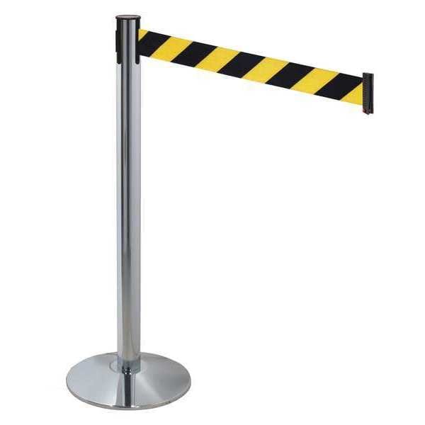 Barrier Post with Belt, Maximum Overall Height 40 in, Legend No Legend, Number of Belts 1, Belt Length 10 ft, Belt Width 3 in, Belt Color Black/Yellow, Belt Pattern Diagonal Stripe, Product Type Stanchion, Includes Hose Clamp Fixing, Wire Clip Belt End, Minimum Overall Height 38 in, Post Diameter 2 1/2 in, Post Material Aluminum, Post Finish Polished, Base Type Round Sloped, Base Configuration Attached, Base Diameter 14 in, Base Material Cast Iron, Base Finish Polished Aluminum