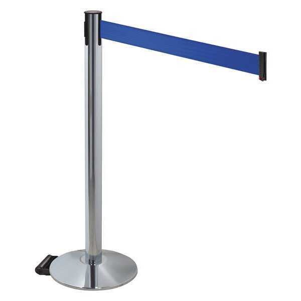 Barrier Post with Belt, Maximum Overall Height 40 in, Legend No Legend, Legend Color Not Applicable, Number of Belts 1, Belt Length 10 ft, Belt Width 3 in, Belt Color Blue, Post Color Gray, Product Type Stanchion, Includes (2) Wheels, Minimum Overall Height Not Applicable, Post Diameter 2 1/2 in, Post Material Aluminum, Post Finish Polished, Base Type Round Sloped, Base Diameter 14 in, Base Material Cast Iron, Base Finish Polished Chrome, Base Color Not Applicable, ADA Compliance No