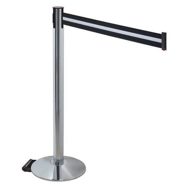 Barrier Post with Belt, Maximum Overall Height 40 in, Legend No Legend, Legend Color Not Applicable, Number of Belts 1, Belt Length 10 ft, Belt Width 3 in, Belt Color Black/White, Belt Pattern Horizontal Stripe, Post Color Gray, Product Type Stanchion, Includes (2) Wheels, Minimum Overall Height Not Applicable, Post Diameter 2 1/2 in, Post Material Aluminum, Post Finish Polished, Base Type Round Sloped, Base Diameter 14 in, Base Material Cast Iron, Base Finish Polished Chrome