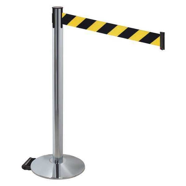 Barrier Post with Belt, Maximum Overall Height 40 in, Legend No Legend, Legend Color Not Applicable, Number of Belts 1, Belt Length 10 ft, Belt Width 3 in, Belt Color Black/Yellow, Belt Pattern Diagonal Stripe, Post Color Gray, Product Type Stanchion, Includes (2) Wheels, Minimum Overall Height Not Applicable, Post Diameter 2 1/2 in, Post Material Aluminum, Post Finish Polished, Base Type Round Sloped, Base Diameter 14 in, Base Material Cast Iron, Base Finish Polished Chrome