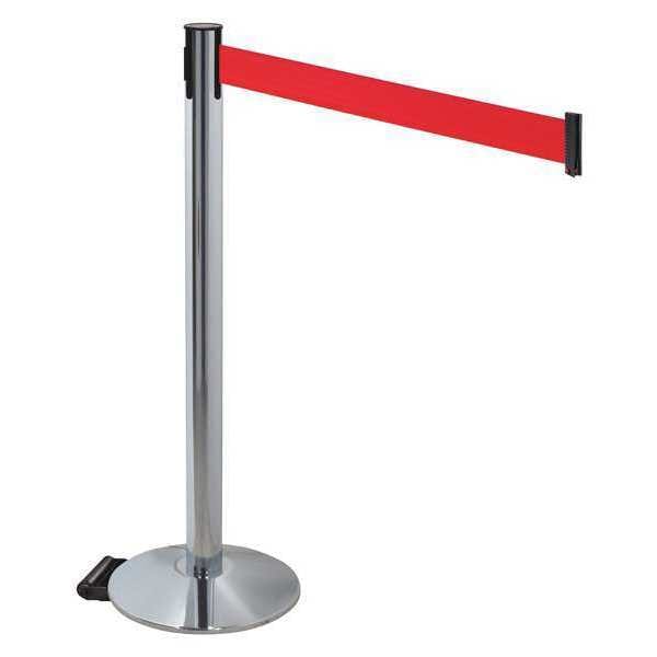 Barrier Post with Belt, Maximum Overall Height 40 in, Legend No Legend, Legend Color Not Applicable, Number of Belts 1, Belt Length 10 ft, Belt Width 3 in, Belt Color Red, Post Color Gray, Product Type Stanchion, Includes (2) Wheels, Minimum Overall Height Not Applicable, Post Diameter 2 1/2 in, Post Material Aluminum, Post Finish Polished, Base Type Round Sloped, Base Diameter 14 in, Base Material Cast Iron, Base Finish Polished Chrome, Base Color Not Applicable, ADA Compliance No