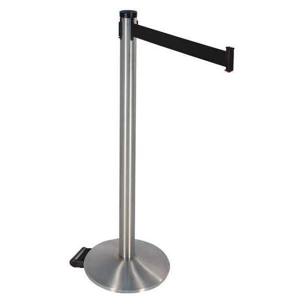 Barrier Post with Belt, Maximum Overall Height 40 in, Legend No Legend, Legend Color Not Applicable, Number of Belts 1, Belt Length 10 ft, Belt Width 2 in, Belt Color Black, Post Color Gray, Product Type Stanchion, Includes (2) Wheels, Minimum Overall Height Not Applicable, Post Diameter 2 1/2 in, Post Material Aluminum, Post Finish Satin Stainless Steel, Base Type Round Sloped, Base Diameter 14 in, Base Material Cast Iron, Base Finish Satin Chrome, Base Color Not Applicable, ADA Compliance No