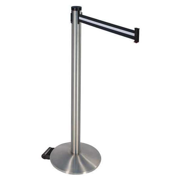 Barrier Post with Belt, Maximum Overall Height 40 in, Legend No Legend, Legend Color Not Applicable, Number of Belts 1, Belt Length 10 ft, Belt Width 2 in, Belt Color Black/White, Belt Pattern Horizontal Stripe, Post Color Gray, Product Type Stanchion, Includes (2) Wheels, Minimum Overall Height Not Applicable, Post Diameter 2 1/2 in, Post Material Aluminum, Post Finish Satin Stainless Steel, Base Type Round Sloped, Base Diameter 14 in, Base Material Cast Iron, Base Finish Satin Chrome