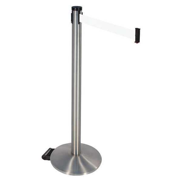 Barrier Post with Belt, Maximum Overall Height 40 in, Legend No Legend, Legend Color Not Applicable, Number of Belts 1, Belt Length 10 ft, Belt Width 2 in, Belt Color White, Post Color Gray, Product Type Stanchion, Includes (2) Wheels, Minimum Overall Height Not Applicable, Post Diameter 2 1/2 in, Post Material Aluminum, Post Finish Satin Stainless Steel, Base Type Round Sloped, Base Diameter 14 in, Base Material Cast Iron, Base Finish Satin Chrome, Base Color Not Applicable, ADA Compliance No