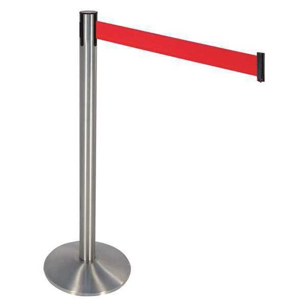 Barrier Post with Belt, Maximum Overall Height 40 in, Legend No Legend, Number of Belts 1, Belt Length 10 ft, Belt Width 3 in, Belt Color Red, Product Type Stanchion, Includes Hose Clamp Fixing, Wire Clip Belt End, Minimum Overall Height 38 in, Post Diameter 2 1/2 in, Post Material Aluminum, Post Finish Satin Stainless Steel, Base Type Round Sloped, Base Configuration Attached, Base Diameter 14 in, Base Material Cast Iron, Base Finish Satin Stainless Steel, ADA Compliance No