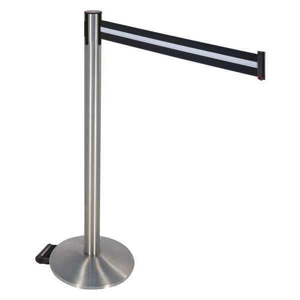 Barrier Post with Belt, Maximum Overall Height 40 in, Legend No Legend, Legend Color Not Applicable, Number of Belts 1, Belt Length 10 ft, Belt Width 3 in, Belt Color Black/White, Belt Pattern Horizontal Stripe, Post Color Gray, Product Type Stanchion, Includes (2) Wheels, Minimum Overall Height Not Applicable, Post Diameter 2 1/2 in, Post Material Aluminum, Post Finish Satin Stainless Steel, Base Type Round Sloped, Base Diameter 14 in, Base Material Cast Iron, Base Finish Satin Chrome