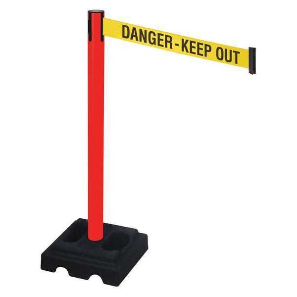 Barrier Post with Belt, Maximum Overall Height 40 in, Legend Danger Keep Out, Legend Color Black, Number of Belts 1, Belt Length 10 ft, Belt Width 3 in, Belt Color Yellow, Post Color Red, Product Type Stanchion, Includes Carrying Handle, Minimum Overall Height Not Applicable, Post Diameter 2 1/2 in, Post Material Aluminum, Post Finish Red, Base Type Square, Base Diameter 14 in, Base Material Rubber, Base Finish Black, Base Color Black, ADA Compliance No, Resistance Properties Rust Resistant