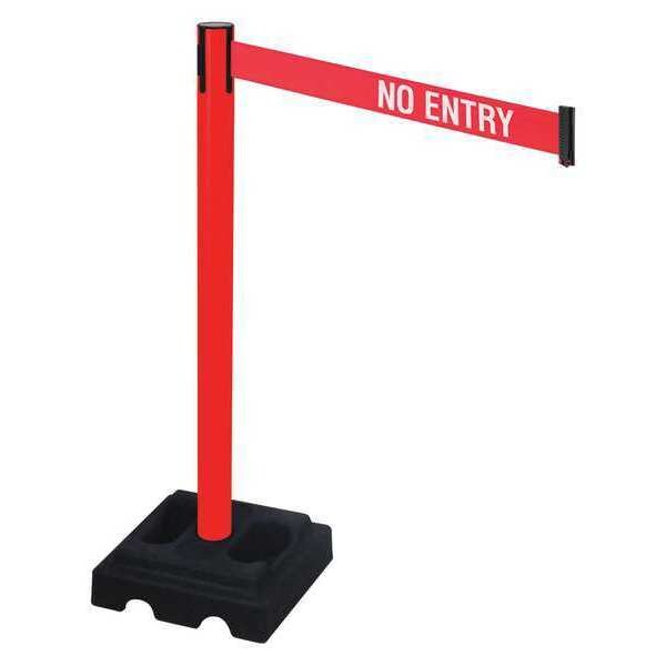 Barrier Post with Belt, Maximum Overall Height 40 in, Legend No Entry, Legend Color White, Number of Belts 1, Belt Length 10 ft, Belt Width 3 in, Belt Color Red, Post Color Red, Product Type Stanchion, Includes Carrying Handle, Minimum Overall Height Not Applicable, Post Diameter 2 1/2 in, Post Material Aluminum, Post Finish Red, Base Type Square, Base Diameter 14 in, Base Material Rubber, Base Finish Black, Base Color Black, ADA Compliance No, Resistance Properties Rust Resistant