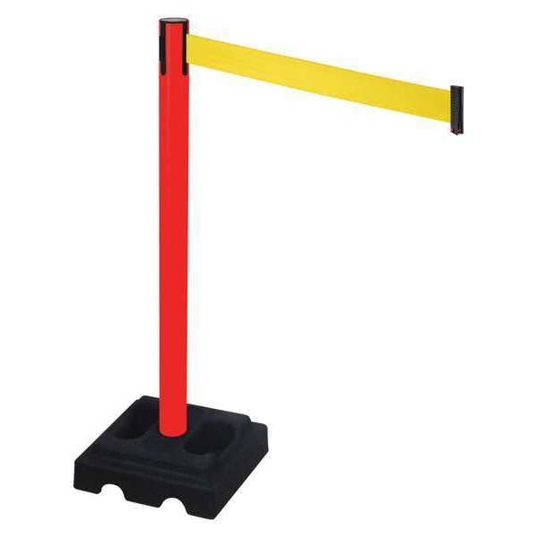 Barrier Post with Belt, Maximum Overall Height 40 in, Legend No Legend, Number of Belts 1, Belt Length 10 ft, Belt Width 3 in, Belt Color Yellow, Post Color Red, Product Type Stanchion, Includes Carrying Handle, Minimum Overall Height Not Applicable, Post Diameter 2 1/2 in, Post Material Aluminum, Post Finish Red, Base Type Square, Base Diameter 14 in, Base Material Rubber, Base Finish Black, Base Color Black, ADA Compliance No, Resistance Properties Rust Resistant