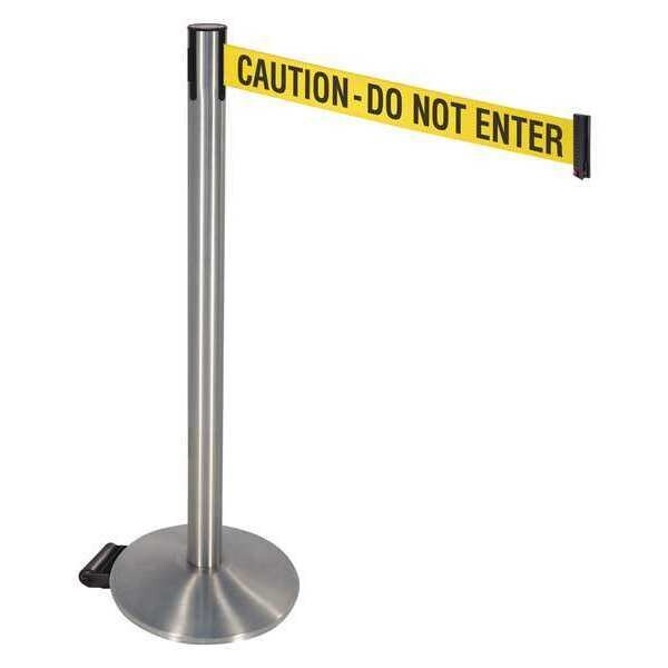 Barrier Post with Belt, Maximum Overall Height 40 in, Legend Caution Do Not Enter, Legend Color Black, Number of Belts 1, Belt Length 10 ft, Belt Width 3 in, Belt Color Yellow, Post Color Silver, Product Type Stanchion, Includes (2) Wheels, Minimum Overall Height Not Applicable, Post Diameter 2 1/2 in, Post Material Stainless Steel, Post Finish Satin Stainless Steel, Base Type Round Sloped, Base Diameter 14 in, Base Material Cast Iron, Base Finish Stainless Steel, Base Color Silver