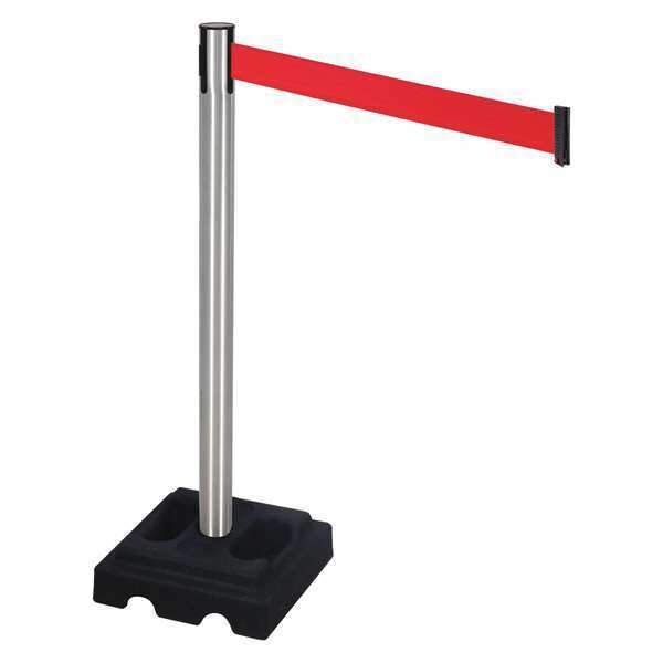 Barrier Post with Belt, Maximum Overall Height 40 in, Legend No Legend, Number of Belts 1, Belt Length 10 ft, Belt Width 3 in, Belt Color Red, Product Type Stanchion, Includes Carrying Handle, Minimum Overall Height Not Applicable, Post Diameter 2 1/2 in, Post Material Aluminum, Post Finish Satin, Base Type Square, Base Diameter 14 in, Base Material Rubber, Base Finish Black, Base Color Black, ADA Compliance No, Resistance Properties Rust Resistant, Height Adjustability Fixed Height