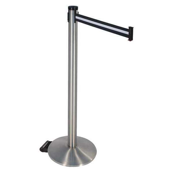 Barrier Post with Belt, Maximum Overall Height 40 in, Legend No Legend, Legend Color Not Applicable, Number of Belts 1, Belt Length 10 ft, Belt Width 2 in, Belt Color Black/White, Belt Pattern Horizontal Stripe, Post Color Silver, Product Type Stanchion, Includes (2) Wheels, Minimum Overall Height Not Applicable, Post Diameter 2 1/2 in, Post Material Stainless Steel, Post Finish Satin Stainless Steel, Base Type Round Sloped, Base Diameter 14 in, Base Material Cast Iron