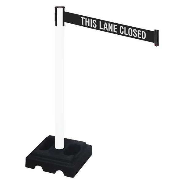 Barrier Post with Belt, Maximum Overall Height 40 in, Legend This Lane Closed, Legend Color White, Number of Belts 1, Belt Length 10 ft, Belt Width 3 in, Belt Color Black, Post Color White, Product Type Stanchion, Includes Carrying Handle, Minimum Overall Height Not Applicable, Post Diameter 2 1/2 in, Post Material Vinyl, Post Finish White, Base Type Square, Base Diameter 14 in, Base Material Rubber, Base Finish Black, Base Color Black, ADA Compliance No, Resistance Properties Rust Resistant