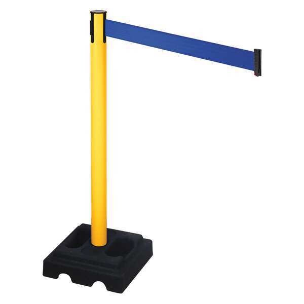 Barrier Post with Belt, Maximum Overall Height 40 in, Legend No Legend, Number of Belts 1, Belt Length 10 ft, Belt Width 3 in, Belt Color Blue, Post Color Yellow, Product Type Stanchion, Includes Carrying Handle, Minimum Overall Height Not Applicable, Post Diameter 2 1/2 in, Post Material Vinyl, Post Finish Yellow, Base Type Square, Base Diameter 14 in, Base Material Rubber, Base Finish Black, Base Color Black, ADA Compliance No, Resistance Properties Rust Resistant