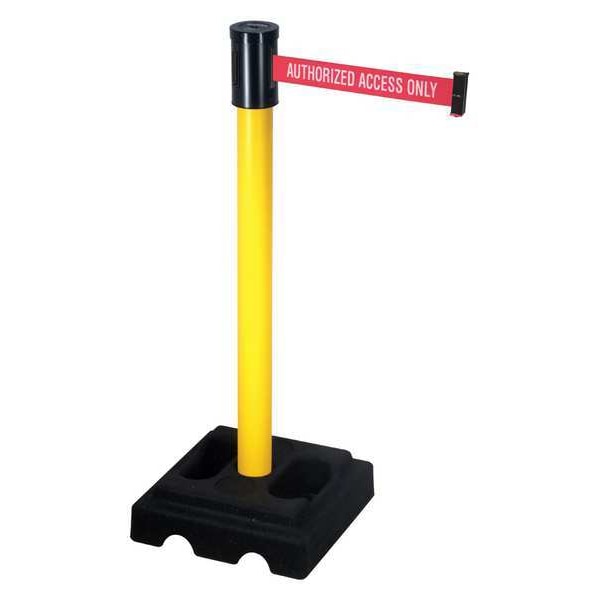 Barrier Post with Belt, Maximum Overall Height 40 in, Legend Authorized Access Only, Legend Color White, Number of Belts 1, Belt Length 15 ft, Belt Width 2 in, Belt Color Red, Belt Pattern No Pattern, Post Color Yellow, Product Type Stanchion, Minimum Overall Height Not Applicable, Post Diameter 2 1/2 in, Post Material Aluminum, Post Finish Yellow, Base Type Round Sloped, Base Diameter 14 in, Base Material Rubber, Base Finish Black, Base Color Black, ADA Compliance No