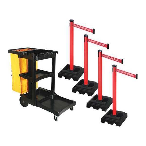 Barrier Systems, Includes Recycled Rubber Base, Maximum Overall Height 46 in, Minimum Overall Height Not Applicable, Belt Length 10 ft, Belt Color Red, Legend Authorized Access Only, Number of Posts 4, Post Color Red, Base Type Square, Includes Cart Yes, Legend Color White, Post Height 40 in, Post Diameter 2 1/2 in, Post Material Aluminum, Base Configuration Attached, Base Diameter 15 in, Base Color Black, Base Material Rubber, Base Weight 23 lb, Fillable No, Cart Height 46 in
