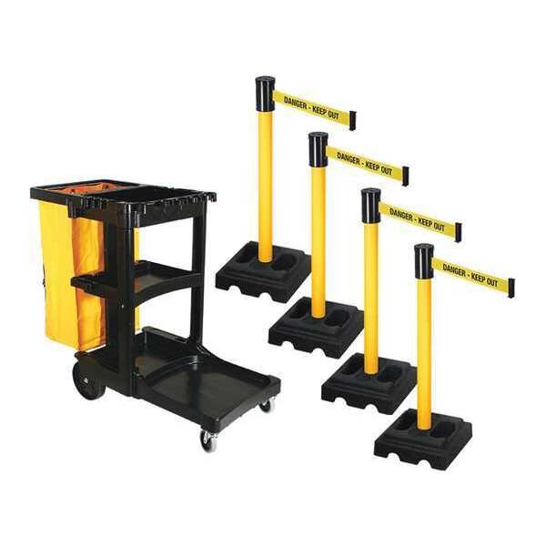 Barrier Systems, Includes Recycled Rubber Base, Maximum Overall Height 46 in, Minimum Overall Height Not Applicable, Belt Length 15 ft, Belt Color Yellow, Legend Danger Keep Out, Number of Posts 4, Post Color Yellow, Base Type Square, Includes Cart Yes, Legend Color Black, Post Height 40 in, Post Diameter 2 1/2 in, Post Material Aluminum, Base Configuration Attached, Base Diameter 15 in, Base Color Black, Base Material Rubber, Base Weight 23 lb, Fillable No, Cart Height 46 in