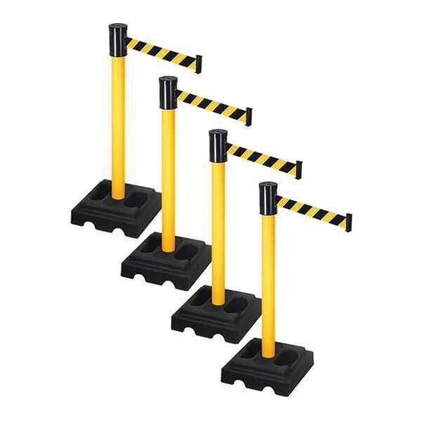 Barrier Systems, Includes (4) Bases, (4) Posts, Maximum Overall Height 44 1/2 in, Minimum Overall Height Not Applicable, Belt Length 15 ft, Belt Color Black/Yellow, Belt Pattern Diagonal Stripe, Number of Posts 4, Post Color Yellow, Base Type Square, Post Height 37 in, Post Diameter 2 1/2 in, Post Material PVC, Base Diameter 15 in, Base Color Black, Base Material Rubber, Fillable No, Cart Height 46 in, Cart Length 21 4/5 in, Cart Width 38 2/5 in, Cart Material Plastic, Cart Weight 33 lb