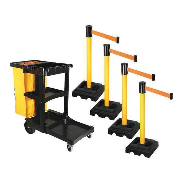 Barrier Systems, Includes Recycled Rubber Base, Maximum Overall Height 46 in, Minimum Overall Height Not Applicable, Belt Length 15 ft, Belt Color Orange, Number of Posts 4, Post Color Yellow, Base Type Square, Includes Cart Yes, Post Height 40 in, Post Diameter 2 1/2 in, Post Material Aluminum, Base Configuration Attached, Base Diameter 15 in, Base Color Black, Base Material Rubber, Base Weight 23 lb, Fillable No, Cart Height 46 in, Cart Length 21 4/5 in, Cart Width 38 2/5 in