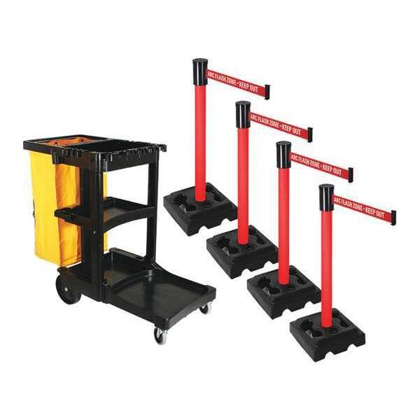 Barrier Systems, Includes Barrier Cart, Bungees and Yellow Bag, Four Posts and Bases, Belt Length 14 ft, Belt Color Red with White Text, Legend ARC Flash Zone - Keep Out, Post Color Red, Base Type Fillable, Square, Post Height 40 in, Post Diameter 2 1/2 in, Post Material PVC, Base Diameter 15 in, Base Color Black, Base Material HDPE, Cart Material Plastic