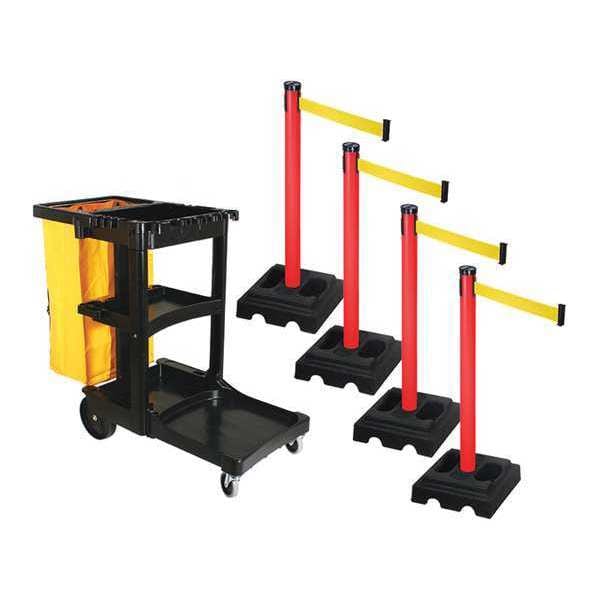 Barrier Systems, Includes Recycled Rubber Base, Maximum Overall Height 46 in, Minimum Overall Height Not Applicable, Belt Length 10 ft, Belt Color Yellow, Number of Posts 4, Post Color Red, Base Type Square, Includes Cart Yes, Post Height 40 in, Post Diameter 2 1/2 in, Post Material Aluminum, Base Configuration Attached, Base Diameter 15 in, Base Color Black, Base Material Rubber, Base Weight 23 lb, Fillable No, Cart Height 46 in, Cart Length 21 4/5 in, Cart Width 38 2/5 in