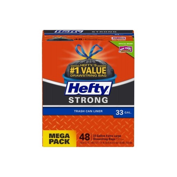 Hefty Extra Strong, 48 Count, 33 Gallon, Extra Large, Trash Can Liner, Drawstring Bag, 9 x 3614, 105 Mil