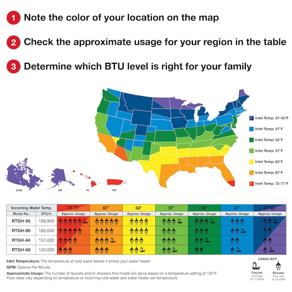 Rheem Prestige® RTGH-90DVLN-2 is a high efficiency condensing indoor natural gas tankless water heater designed for continuous hot water. Industry leading low flow activation with a minimum flow rate of .26GPM and minimum activation flow rate of .40GPM ensures hot water is received even in low demand situations. Ultra Low NOx burner meets SCAQMD rule requirements of safety with low emissions. While our exclusive Guardian Overheat Film Wrap prevents our units from reaching the dangerous temperatures others can. Add in our maintenance notification settings, self-diagnostic system and EcoNet enabled mobile app feature (additional kit available), buying the Rheem Prestige tankless water heater makes perfect sense. New 2"venting with band connections allow up to 150' with a 3"PVC or 60' with a 2"PVC pipe. Included are also a built-in condensate neutralizer, digital remote control and 10ft. of thermostat wire. Best if used with up to 4 bathrooms; .93UEF (.96EF Canada), 180,000BTU efficiency. Can be used with up to 5 bathrooms depending on inlet temperature; .93UEF (.96EF Canada) efficiency.