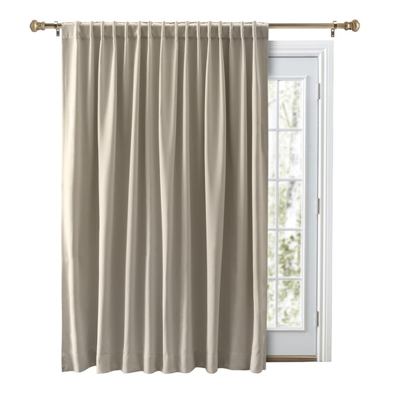 Independently U.S. laboratory tested certifies this curtain is 99.8% efficient in blocking out light! The perfect sidekick for movie marathons and lazy Sunday sleep-ins, room darkening curtains keep entertainment areas almost as dark as the theaters. This heavyweight curtain panel features a superior, triple weave fabric construction that blocks out light and stops heat and cold from penetrating through the density of its construction, which invisibly integrates black yarn into the pattern of colored yarns. This single 112 in. double wide curtain panel is perfect for patio doors and double wide windows. This panel has a generous 4 inch length rod pocket and back tab. It also features 1 in. side hems and an extra deep 5 in. bottom hem. The rod pocket with back tab header makes the panel open and close with ease or, for a decorative effect, place the curtain rod through the belt loop tabs on the back and your Beretta Double-wide Solid Blackout Thermal Rod Pocket with Back Tab Curtain Panel will now have pleats! Available in both 84 in. and 96 in. lengths and comes in 8 bold colors. Machine washable. Tumble dry low. Imported. TRIPLE WEAVE WOVEN FABRIC: This unique fabric is both casual and elegant, creating a warm natural look and feel in any space. This gorgeous fabric is comprised of black threads and colored yarns that effectively blocks light and insulates against heat and cold.ROD POCKET: A 4 in. top rod pocket style creates a soft gathered tailored look or utilize the back tabs for a pleated look. Includes one 112 in. wide panel. For proper fullness and coverage, order curtains that are 1-1/2 times the width of the window area EASY CARE: This product is machine washable, making it quick and easy to get your curtains back into tip top shape when the time comes. This fabric has been hand chosen for both durability and quality, and you can be confident that it will endure the test of time. For the best look, we recommend that window coverings be steamed or ironed out of the package EXPERT CRAFTMANSHIP: As curtain-makers for 30+ years, we are experts at creating the perfect window covering. No detail is overlooked, and our products are designed to hang beautifully within your home, giving you a very custom look and feel .