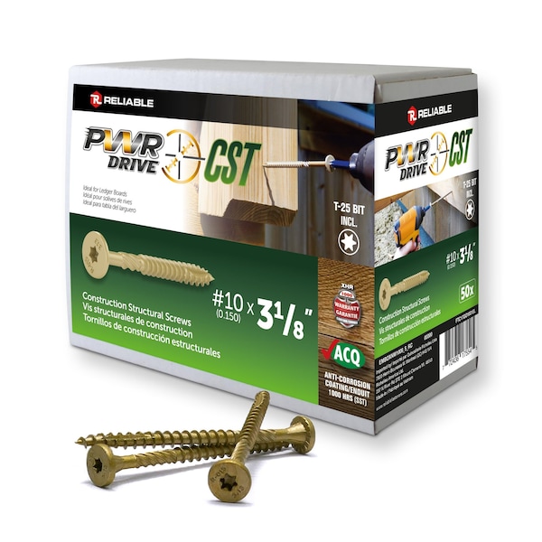 The PWR DRIVE CST screw is made of hardened steel to provide a degree of high tensile strength, high torque, and super shear strength that a regular lag screw just cannot offer. This gives an instant advantage of not having to pre-drill, which is quite a time saver on the job site. The sharp threads and points bite quickly, a type 17 tip reduces wood splitting and a clearing thread, called the ''U'' thread, reduces the friction on the screw shank, for reduced driving torque and more importantly increased battery life for your tools. The PWR DRIVE CST has a wide flat head with nibs and under-head cutting serrations for easy countersinks and will embed in wood with an incomparable clean finish. This screw also has a T-40 firm-grip drive provides exceptional torque strength and allows the CST to stick to the bit, which is paramount when working in tight spaces. For all these reasons, PWR DRIVE CST screws are a great replacement for lag screws and are the screws of choice for structural 'spec' applications.