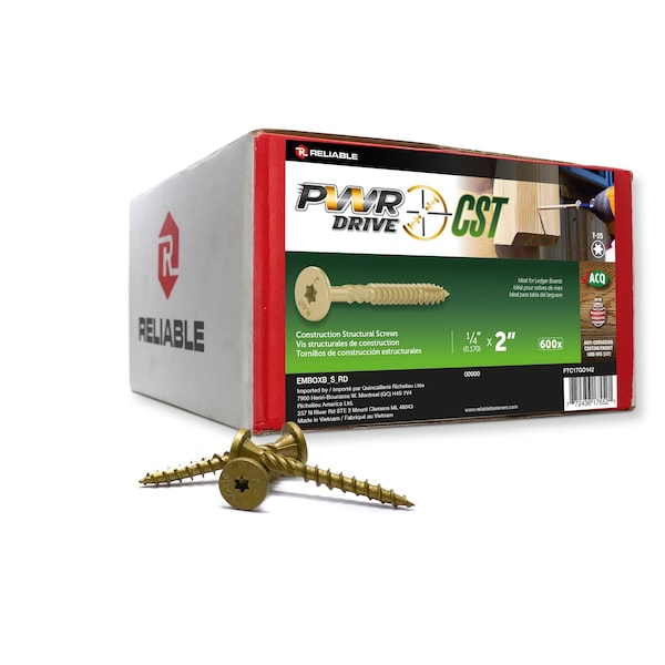 The PWR DRIVE CST screw is made of hardened steel to provide a degree of high tensile strength, high torque, and super shear strength that a regular lag screw just cannot offer. This gives an instant advantage of not having to pre-drill, which is quite a time saver on the job site. The sharp threads and points bite quickly, a type 17 tip reduces wood splitting and a clearing thread, called the ''U'' thread, reduces the friction on the screw shank, for reduced driving torque and more importantly increased battery life for your tools. The PWR DRIVE CST has a wide flat head with nibs and under-head cutting serrations for easy countersinks and will embed in wood with an incomparable clean finish. This screw also has a T-40 firm-grip drive provides exceptional torque strength and allows the CST to stick to the bit, which is paramount when working in tight spaces. For all these reasons, PWR DRIVE CST screws are a great replacement for lag screws and are the screws of choice for structural 'spec' applications.