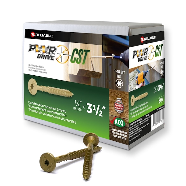 The PWR DRIVE CST screw is made of hardened steel to provide a degree of high tensile strength, high torque, and super shear strength that a regular lag screw just cannot offer. This gives an instant advantage of not having to pre-drill, which is quite a time saver on the job site. The sharp threads and points bite quickly, a type 17 tip reduces wood splitting and a clearing thread, called the ''U'' thread, reduces the friction on the screw shank, for reduced driving torque and more importantly increased battery life for your tools. The PWR DRIVE CST has a wide flat head with nibs and under-head cutting serrations for easy countersinks and will embed in wood with an incomparable clean finish. This screw also has a T-40 firm-grip drive provides exceptional torque strength and allows the CST to stick to the bit, which is paramount when working in tight spaces. For all these reasons, PWR DRIVE CST screws are a great replacement for lag screws and are the screws of choice for structural 'spec' applications.