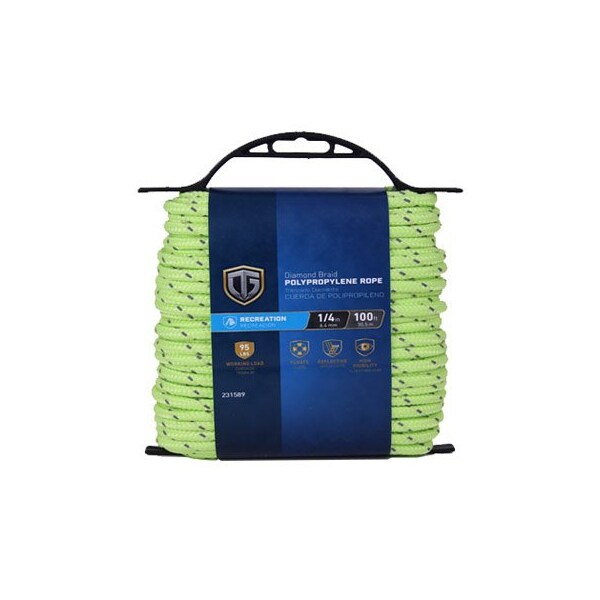 14 x 100', Reflective Lime, Polypropylene Rope, 95 LB, Safety Work Load, Diamond Braided, Light Weight Floats, Comes On A Winder
