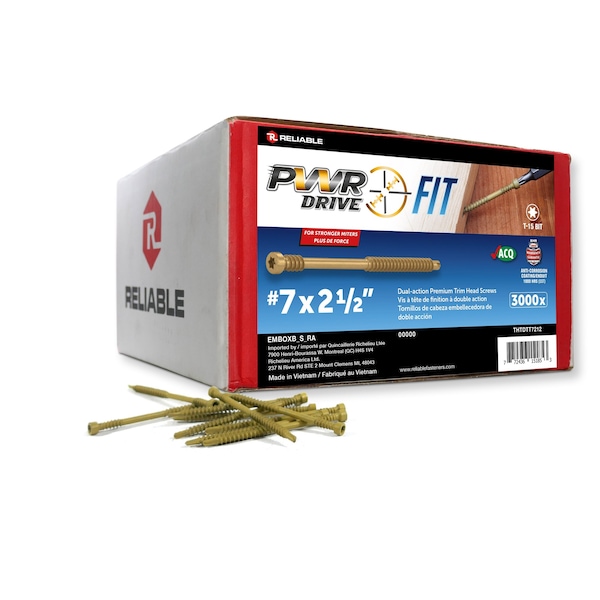 PWR Drive is the new premium line of screw products from Reliable. The PWR Drive FIT trim head screw is used for all trim applications and specializes in assembling stronger miters. This screw has a special drill tip to help with tricky angle starts, outperforming type 17 to prevent wood splitting. This feature allows the FIT to be used for face screwing but also on the side of regular 3/4 in wood boards. The biggest asset of the FIT is its ''slow'' second thread producing a clamping effect giving an unmatched assembly strength. In essence, since all trim head screws have by nature small heads that cannot push, the second thread replaces the strength that the head of a regular flat head wood screw would produce. The FIT is the best of both worlds: Assembly strength with a small head that almost disappears. All FIT screws come with a certified corrosion resistant coating compliant with the IBC and IRC building codes. Watch the video to see the benefit it brings to deck staircase assemblies