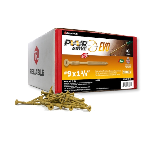 Power Drive is the New Premium line of screw products from Reliable. The PWR Drive EVO is the general construction screw from that line, used for decking, fencing or any framing applications. This screw has all the bells and whistles available today: Type 17 to prevent splitting, 3 level of under head nibs for the cleanest finish ever produced and a T-25 no slip sticky drive. The biggest difference of the EVO is its second thread. This thread being slower than the first one will produce a clamping effect simply impossible to obtain with any other screw on the market today. Plus, the EVO #10 x 5 and #10 x 6 in. with its very special thread design is especially designed for toe screwing assemblies angle very common in framing and has to be one of the most innovative ideas to hit the fastener market in the past 15 years. All EVO screws come with the same corrosion resistant coating that is used on our structural screws that is certified compliant with the IBC and IRC building codes. Watch the video and see the difference.