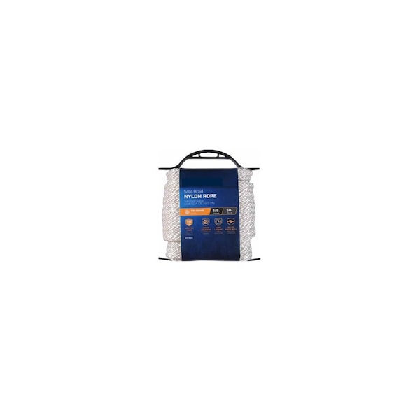 3/8in x 50 ft, White, Smooth Braided Nylon Rope, 190 LB Safety Work Load, Comes On A Winder.