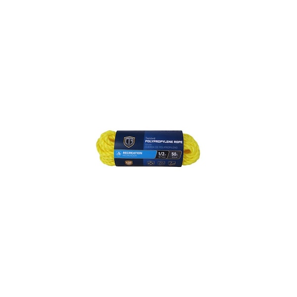 1/2in x 50ft, Yellow, Twisted Polypropylene Rope, 420 LB, Safety Work Load, Light Weight & Floats, Hank.