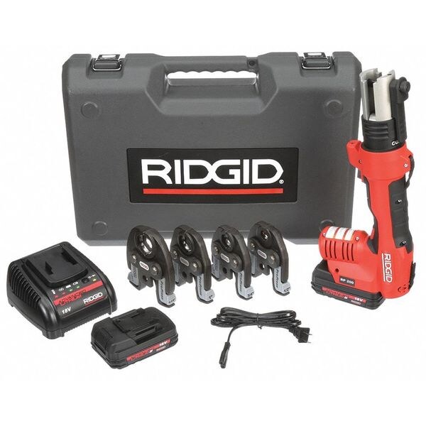 Cordless Compact Pressing Tool, For Pipe Size (In.) 1/2 to 1-1/4, Voltage 18, Amps AC 1.1, Ram Force (Lb.) 5400, Crimp Time (Sec.) 5, Max. Pressure (PSI) 200, Temp. Range (F) 15 to 122 Degrees , Height (In.) 6, Length (In.) 13, Width (In.) 2, Includes Jaws 1/2 In. to 1-1/4 In., 3 ft. Universal Cable Extension, Battery, Charger, Carrying Case