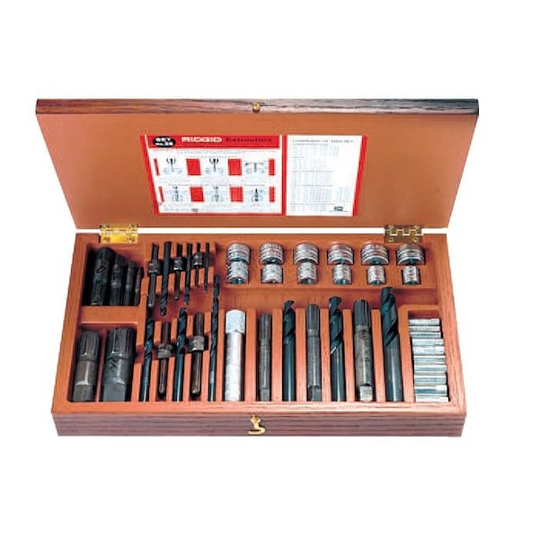 When seized screws or broken pipe ends bring jobs to a stand-still, the Model 25 Screw & Pipe Extractor set has what you need: 8 screw extractors, 9 drill bits, 10 solid drill guides, 30 sleeve drill guides and 6 pipe & plug extractors. Constructed from hardened steel and packed in a fitted compartment box.