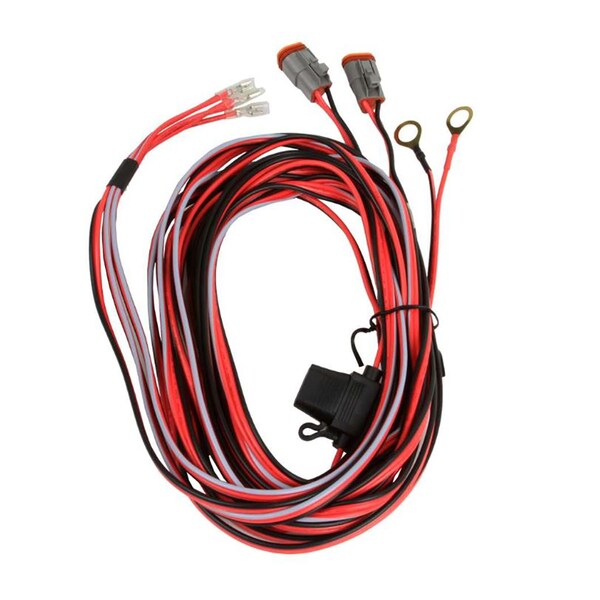 3 Wire Pair Lights Low Power Harness. This 17' wiring harness is designed to connect a pair of Hi/Lo LED lights to your 12V electrical system. It features battery terminals on one end and Deutsch connectors on the other to connect to the lights. It incorporates an inline fuse holder and a waterproof switch.. This harness is compatible with the following RIGID Industries LED Lights: D2 H/L (Pair). SRQ2 H/L (Pair).