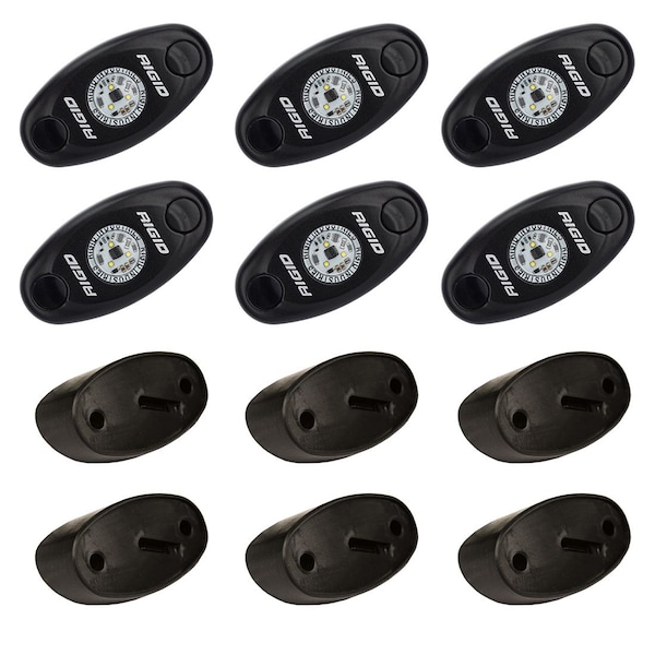 A-Series Rock Light Kit - 6 Cool White Lights - Black. The RIGID Rock Light Kit uses the power and durability of A-Series LED lighting and adds custom 15' leads on each light, a distribution block, plus switch and angled mounts to light up any truck, Jeep, or all-terrain vehicle. This kit will allow you to light up the trail with strategically placed lights on the vehicle. Perfect for night rock crawling, the LED lights are available in a variety of colors, including white, red, blue, green, or amber to aid night vision or accent vehicle colors. Rock Light Kits are available in 4-light or 6-light configurations to enhance and customize your night crawling experience.. Features: 50000+ Hr LED Lifespan. Instant On/Off - No Warm Up. RoHS Compliant. Over / Under Voltage Protection. Extruded Aluminum Housing. Durable Polycarbonate Lens. Integrated Thermal Management. GORE Pressure Equalizing Vent. Designed, Engineered, & Assembled in the USA Included: A-Series with 15' Leads. Distribution Block for Easy Wiring. 8' Wiring Harness. Angled Mounting Pads w/30o Angle. Mounting Hardware.