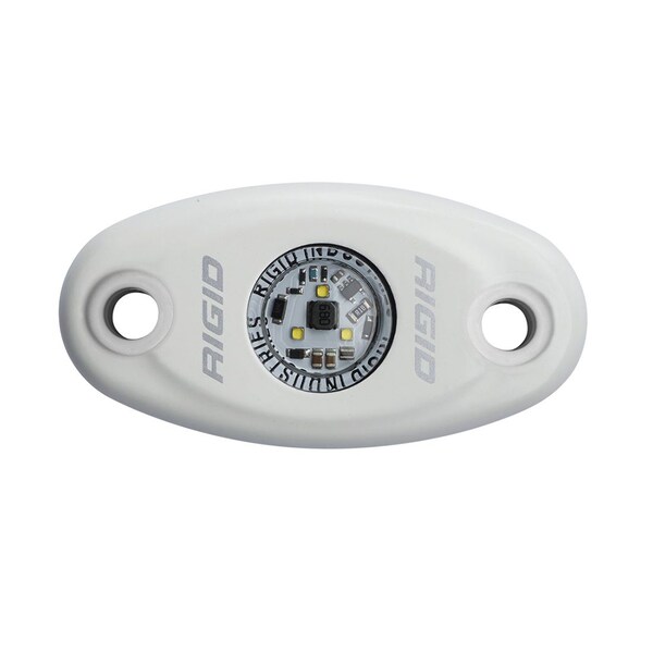 A-Series High Power Single LED Light - Cool White. RIGID' s A-Series LED Accessory Light is the universal light that can be used just about anywhere. Vehicle cabs, boat cabins, work vehicle beds, under the hood of a vehicle and trunks are just a few of the places where the A-Series can provide handy bright lighting in otherwise dark environments. The A-Series has a durable compact aluminum housing and includes rubber flat-mount, 3M VHB, 2 way pad for flat mounting, and radius tube-mount adapters, which provide side or bottom wire exits to accommodate different applications. It is lightweight, waterproof, and available in a variety of different LED colors in high and low power versions. The versatility of the A-Series makes it an easy installation on almost anything.. Features: Cool White. High Power. Epoxy Sealed No Vent. 24" Molded Wire Ingress. IP68 Compliant -Dust / Water Ingress. 50,000+ Hour Lifespan. 10-28 V DC. Impact Resistant Polycarbonate Lens. Integrated Thermal Management System Specifications: Watts: 4. Amp Draw: 0.43. Voltage Max: 28. *Raw Lumens: 400. Lux @ 10M: 2.50. Beam Distance @1Lux: 15.80. Beam Distance @.25Lux: 31.60. Horizontal Beam Angle: 80.30 Whats In The Box? Mounting Hardware. 2 Mounting Hole Rubber Plugs1 Adhesive Primer. 1 VHB Mount Tape. 1 Flat Mount Adapter. 1 Tube Mount Adapter. 3ft. Wire Extension. 2-Wire Open Lead, No Connector.