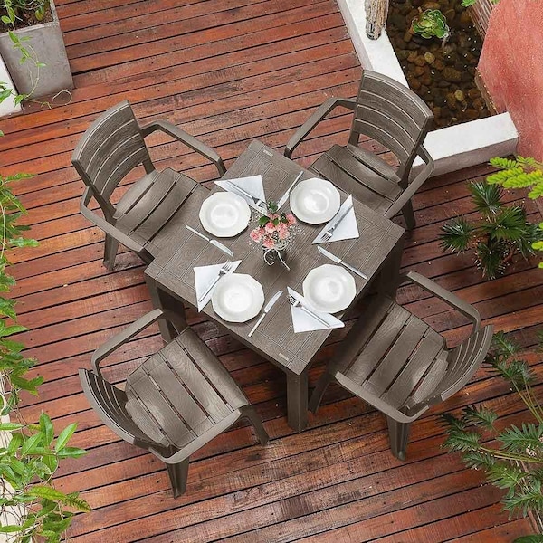 - •5-Piece Dining Set finished in Mocca is perfect for indoor or outdoors use and features 4 chairs with arms as well as a square table.
