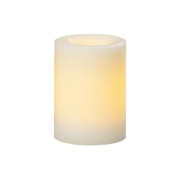 Sterno Home 3x4 cream all weather wax LED candle Includes new dusk sensor technology that automatically turns candle on for 5 hours at sunset The IP44 rating protects the electronics from water splashing in all directions Crafted heat resistant wax is designed to withstand extreme temperatures up to 122 degrees Made to withstand high winds as it's 300 percent heavier than traditional plastic outdoor candles Warm amber LED lasts for 1000 hours on 2 AA batteries not included Includes 3 position switch onoffdusk sensor