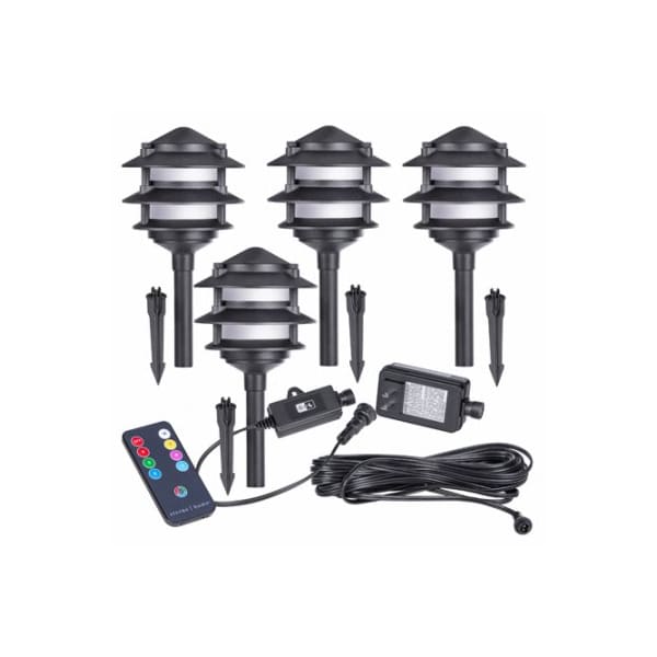 4 piece, low voltage path light kit Each LED light has a 30 lumen output Traditional tiered designed light can be changed from warm white to colorshifting by a touch on the included remote 50 ft of 18AWG wiring, 10W transformer and control box is also included Each light is 59 x 59 x 117